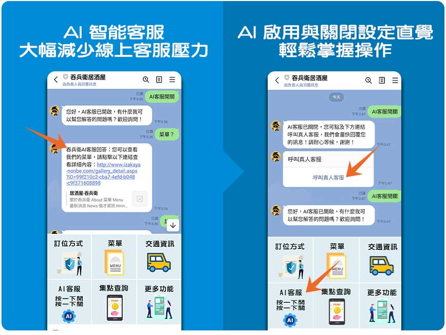 吞兵衛每天都有大量顧客透過 LINE 詢問問題,例如營業時間、菜單內容、訂位方式等,而且問題非常重複。原本都由我們人工回覆,不但費時,還容易漏訊。後來加購快集點的 AI 智能客服服務,這些常見問題都可以自動即時回應,24 小時不間斷,幫我們省下大量人力。AI 懂得抓關鍵字,自動對應到預設的回覆,還能針對不同問題分類呈現。就連特殊節日的營業公告,也可以事先設定好時間自動發送,讓客服回覆更穩定、有品質。我們的員工也能將精力放在現場服務上,線上線下的效率都同步提升。