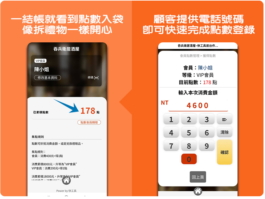 吞兵衛過去使用的 POS 系統並沒有內建的會員功能,我們只能透過傳統的簡訊方式通知客人優惠訊息,不但效果有限,也難以追蹤客戶是否真的有來店消費。而且操作上非常繁瑣,常常還會漏掉重要的名單。自從導入快集點後,顧客只要簡單動作就能加入會員,不需下載任何 APP,大幅降低進入門檻。我們也能輕鬆設定「生日月提醒」,主動向即將生日的顧客發送祝福與優惠,整個顧客經營流程更自動化、更貼心。這對我們這樣日常忙碌的餐飲店來說,真的是一大福音,讓人情味與系統化得以並行。