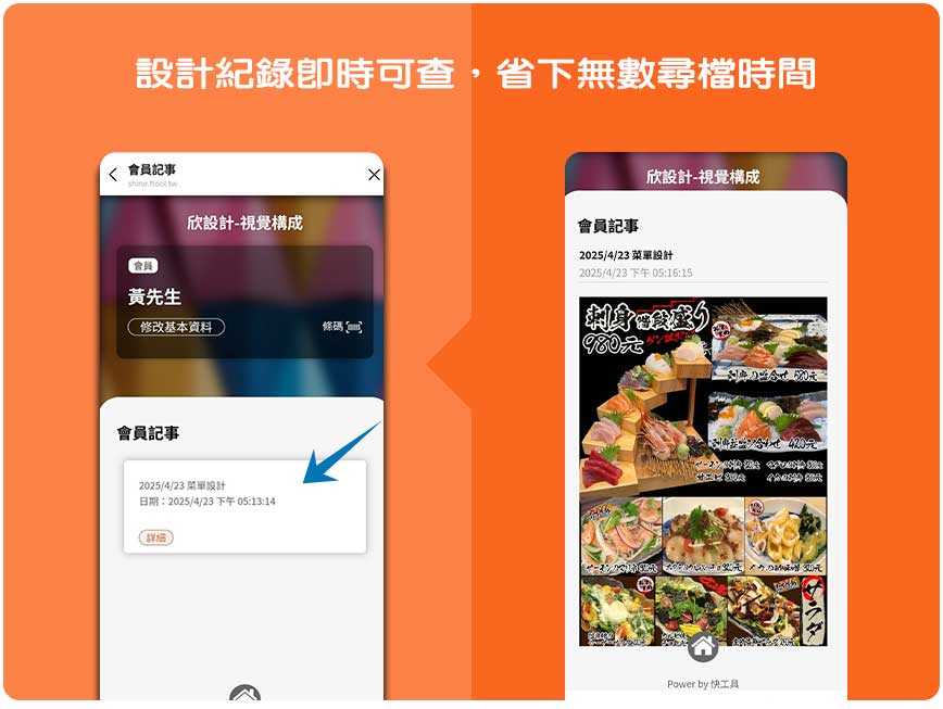 過去,當客戶想要查詢過往合作的設計檔案,總需耗費設計師大量時間,從檔案伺服器中搜尋、比對、轉傳,不僅影響工作效率,也延誤了回應速度。導入快工具後,欣設計善用「客戶記事本」功能,讓每一次設計定案後的檔案,都能直接上傳到專屬客戶的記事本中。客戶不需再透過電話或訊息詢問,隨時可以登入查看,無論是重新印製、修改,還是參考舊案,都更加方便。這項功能不僅大幅減少設計師的非設計工時,也讓客戶感受到更高的服務效率與自主權。