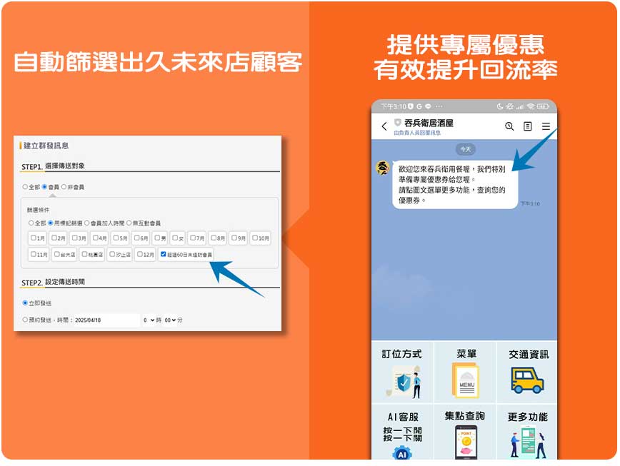 再好的餐廳,也難免會有曾經來訪但久未回流的顧客。過去我們只能靠印象或資料庫一筆筆查找,很難主動針對這類顧客進行行銷。快集點提供的「喚醒久未來店顧客」功能,能自動篩選出超過一定時間未來的會員,並透過 LINE 推播送上專屬回饋,像是優惠券、限時小禮等。實際操作後,我們發現這個功能帶來將近 40% 的回流效果,許多顧客甚至留言「收到訊息才想起來這家店,好懷念!」。這種被貼心提醒、再次邀請的感覺,對顧客來說是種好感加分,對我們來說則是實實在在的回流轉換。