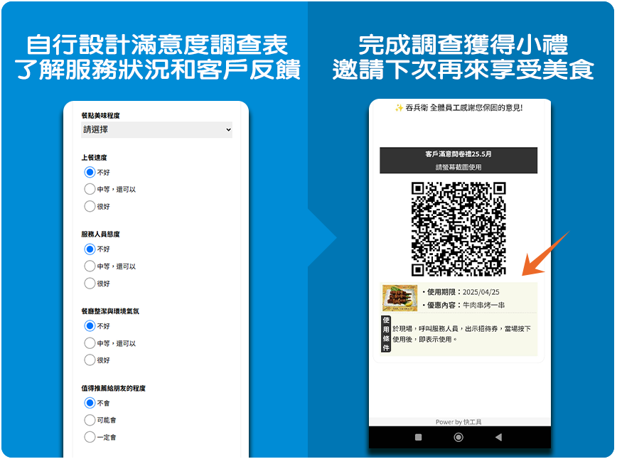 我們一直很重視顧客用餐後的感受,也想了解員工在第一線的服務品質是否穩定。但以前光是發問卷、回收、整理就耗費不少時間。快集點提供的「不記名顧客滿意度調查」功能非常實用,顧客掃描 QR Code 就能匿名填寫,簡單幾題就能完成意見回饋。填寫後還能設定自動發送一份下次消費可兌換的小禮物,提升填寫意願,也為回流創造契機。這樣的雙向互動,讓我們更了解服務盲點,也能即時回饋給員工作為鼓勵或調整依據,是一套對內外都受益的好工具。
