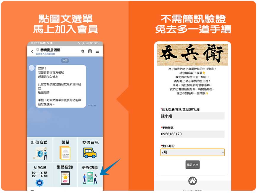 吞兵衛過去使用的 POS 系統並沒有內建的會員功能,我們只能透過傳統的簡訊方式通知客人優惠訊息,不但效果有限,也難以追蹤客戶是否真的有來店消費。而且操作上非常繁瑣,常常還會漏掉重要的名單。自從導入快集點後,顧客只要簡單動作就能加入會員,不需下載任何 APP,大幅降低進入門檻。我們也能輕鬆設定「生日月提醒」,主動向即將生日的顧客發送祝福與優惠,整個顧客經營流程更自動化、更貼心。這對我們這樣日常忙碌的餐飲店來說,真的是一大福音,讓人情味與系統化得以並行。
