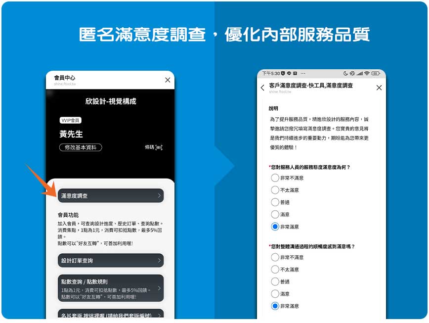 以往想要了解客戶的真實感受,多靠口頭詢問或簡單訊息確認,但多數客戶難以坦率表達,無法有效優化服務。快工具內建的「客戶滿意度調查」功能,讓每位完成設計案的客戶可匿名填寫回饋表單,設計流程、服務態度、交件品質等皆納入評分指標。完成後還可贈送下次消費的小禮物,提升填寫意願。這對欣設計來說,不僅有助於管理內部員工的服務表現,也能即時掌握客戶滿意度變化,及早調整溝通或流程,真正實現以客為尊的服務精神。